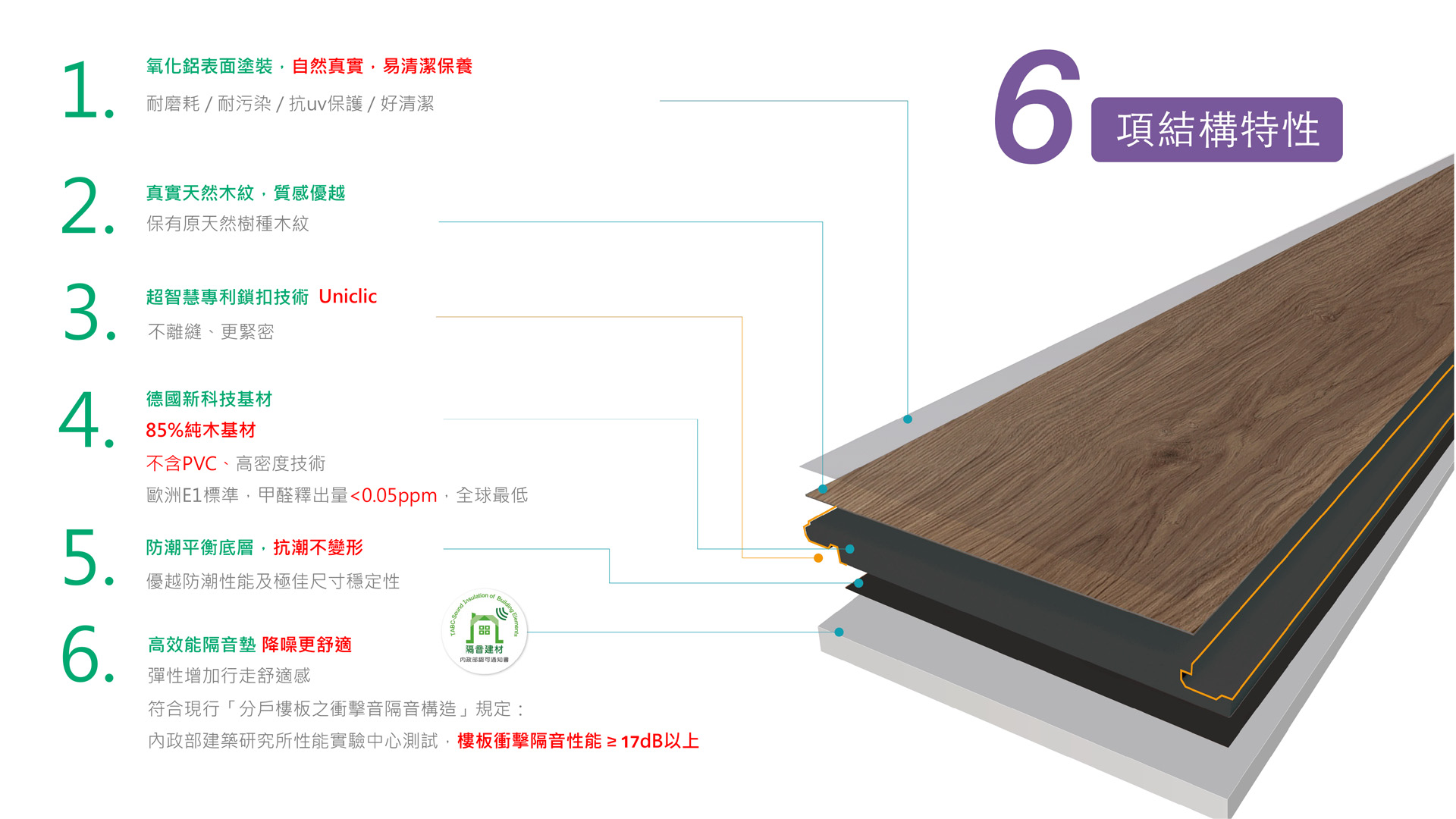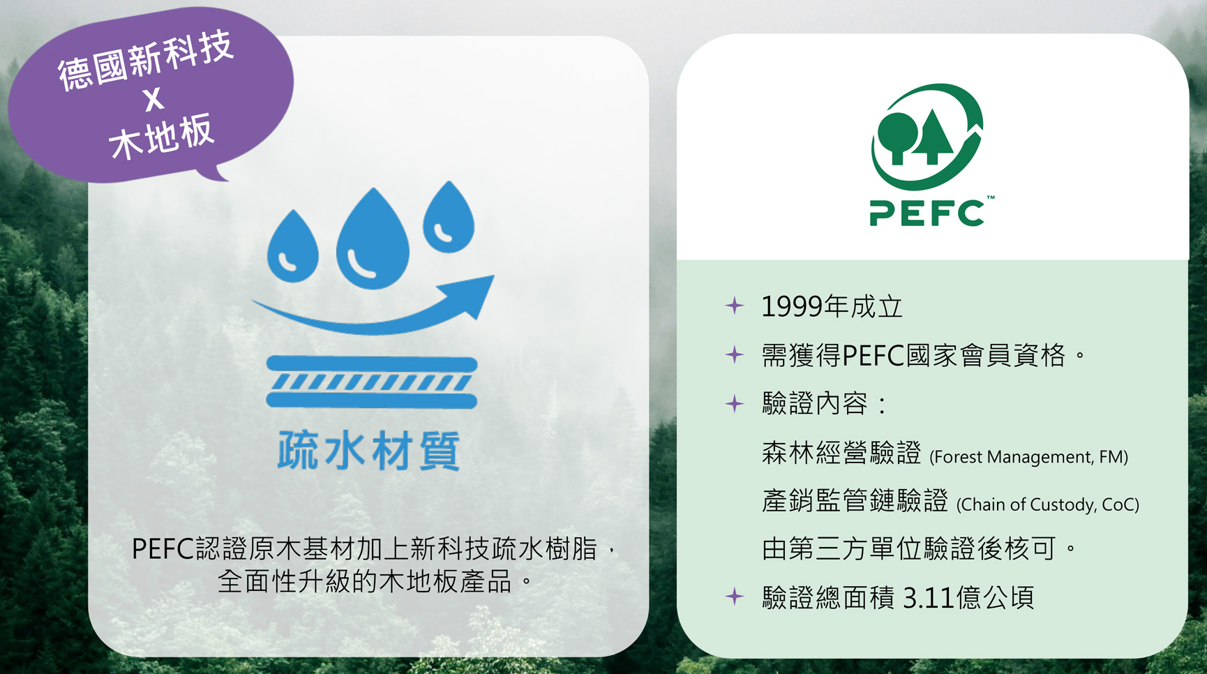 德國百年企業KRONOTEX防水系列KIWI,具隔音墊以及防潮平衡底層,莫氏硬度9級,新科技PEFC認證純木基材加上疏水樹脂,不含PVC,歐洲E1全球最低甲醛健康建材。