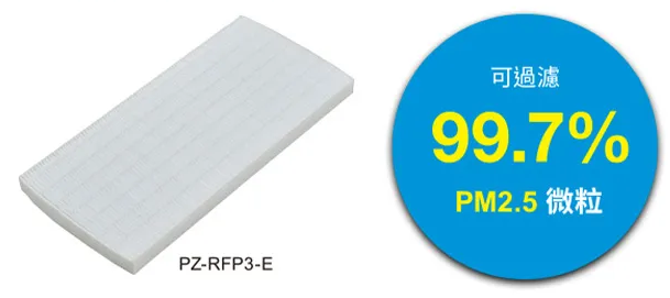 新款選購濾網(PZ-RFP3-E)可去除除99.7%大於0.5ppm 的微粒。藉由去除污染物,提供新鮮潔淨的空氣。