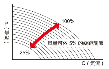彈性的風量設定可防止通風過量,進而節省能源!送風和排氣風扇轉速可在 25%〜100% 範圍內靈活調節,確保充足的風量。本系统可依5%增量調節氣流。
