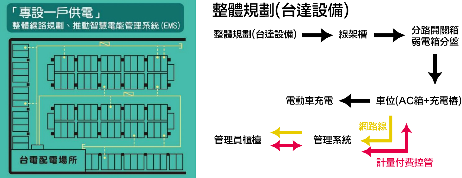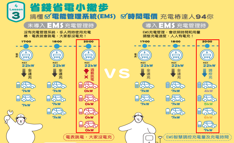 在有限的電力容量下,盡可能的服務更多車輛。同時也避免使用之負載過多,導致電力跳脫。導入EMS後,不僅減少人力需求,也善用時間及電量調配,達到人人皆有電充。