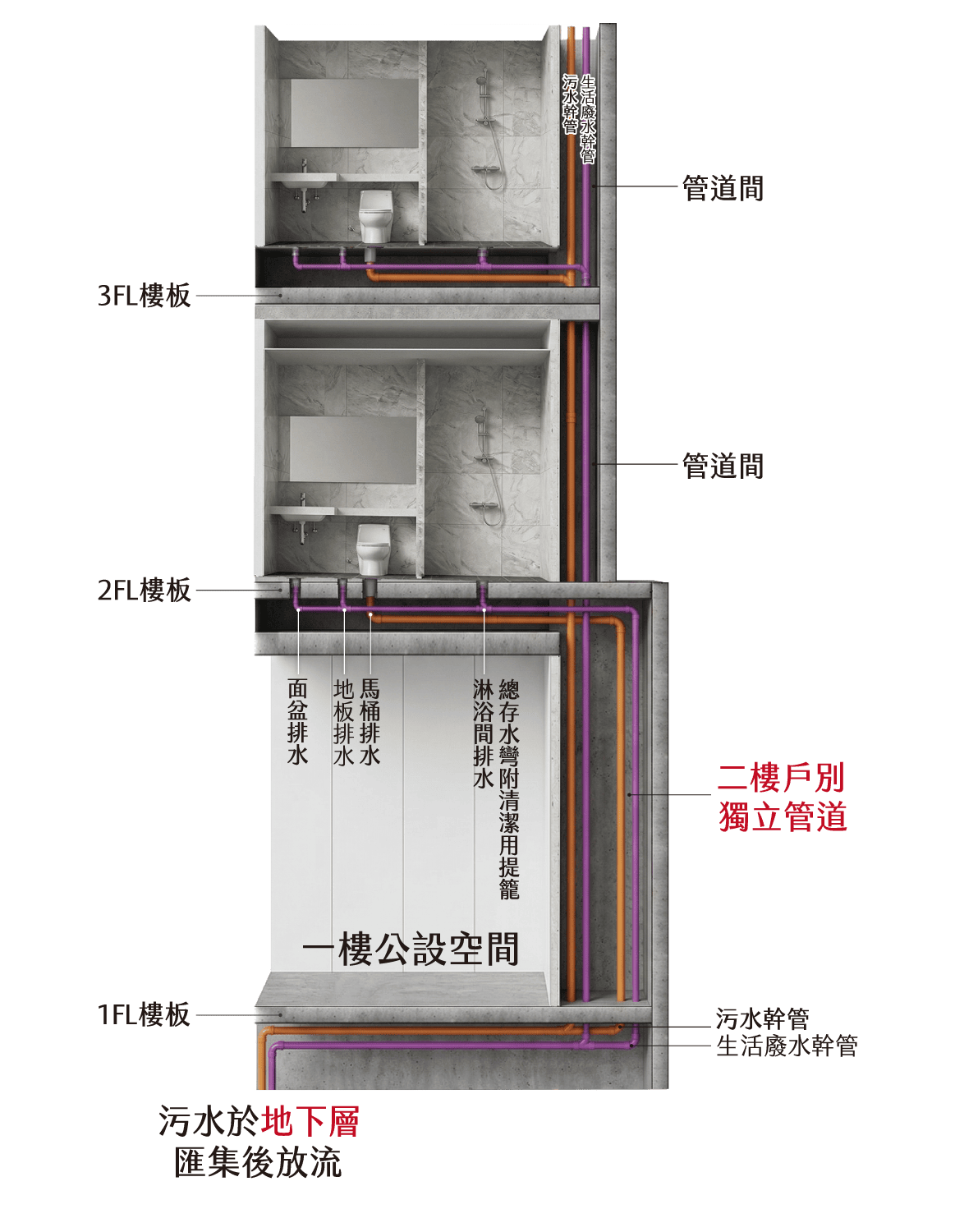 所有管路匯集於B1樓層,降低低樓層管路噪音與爆管風險。