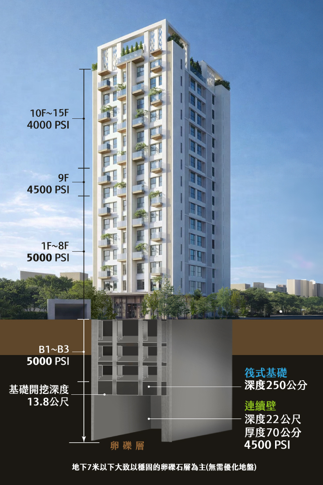 深度250cm筏式基礎減少差異沉陷,增加結構耐震性